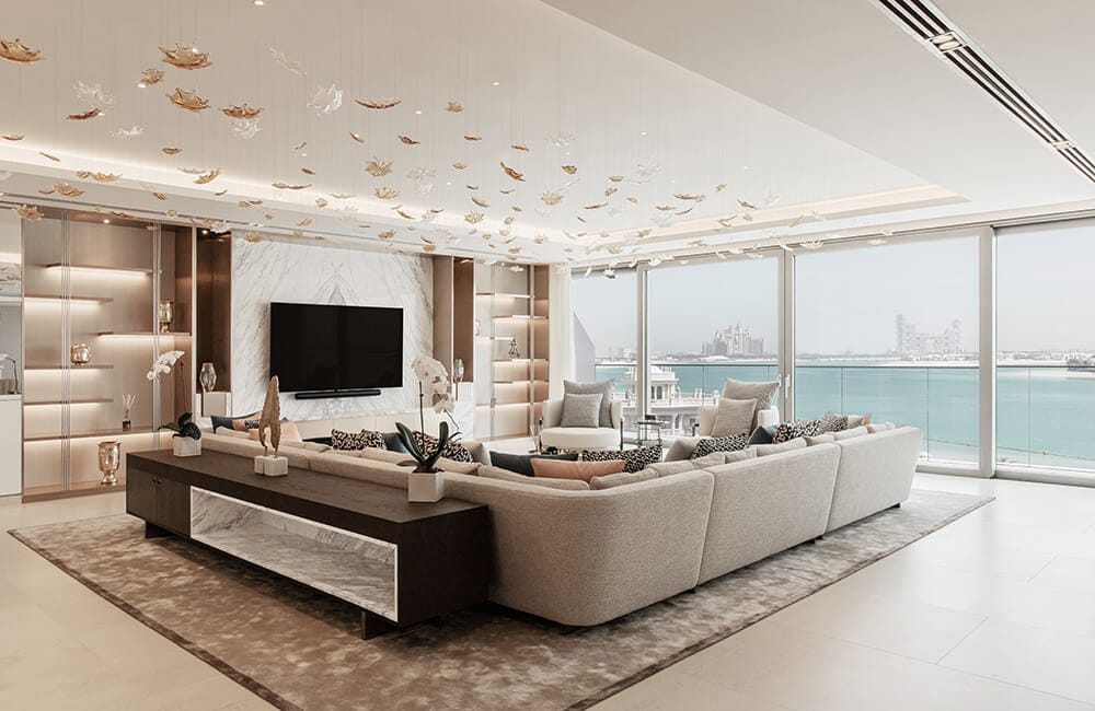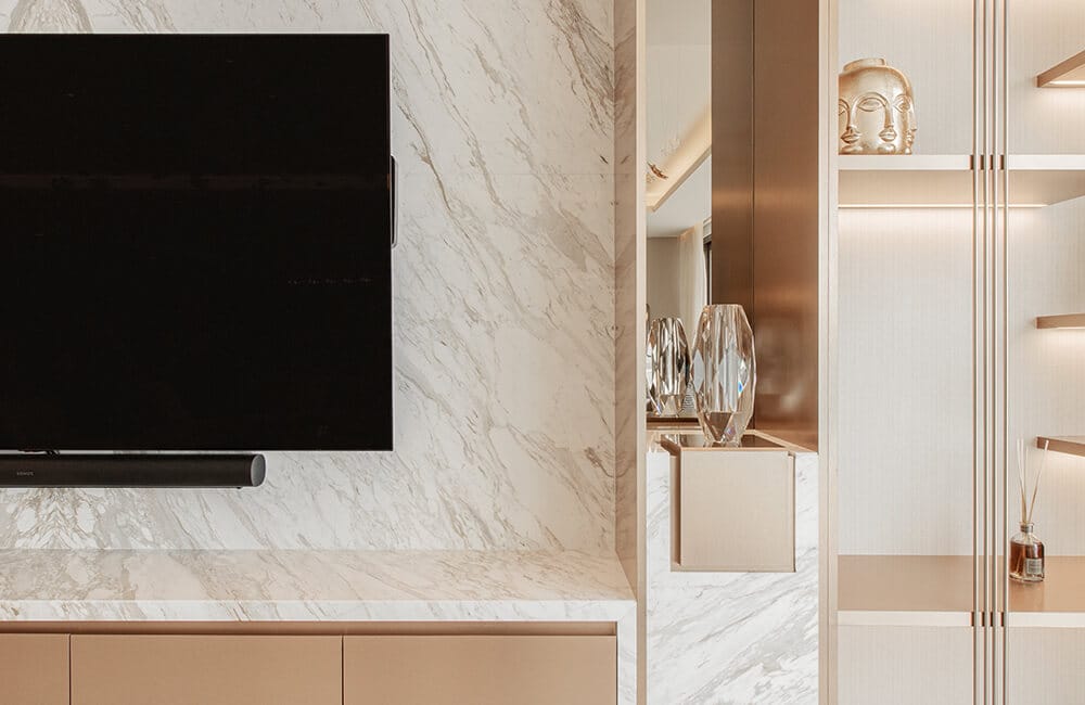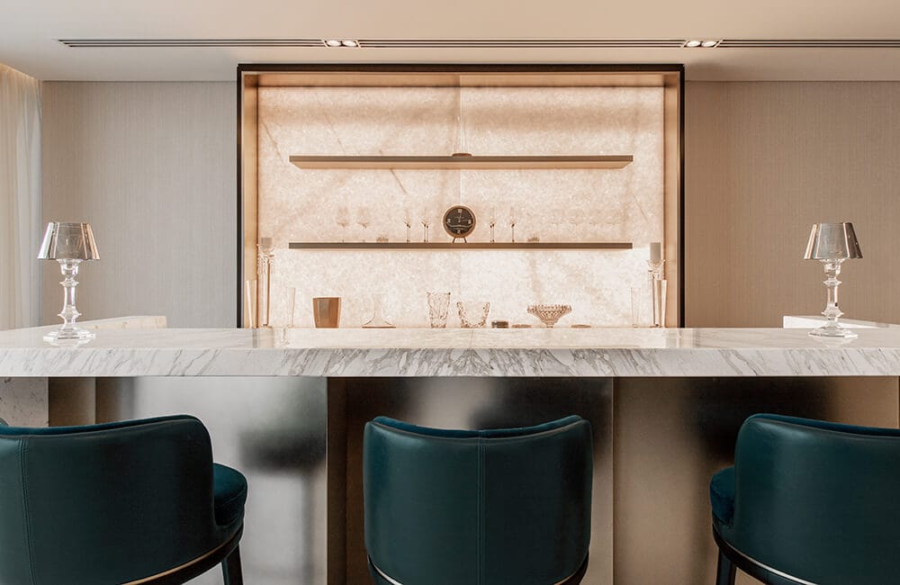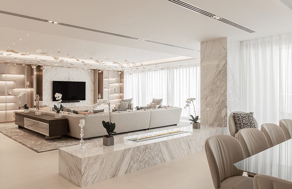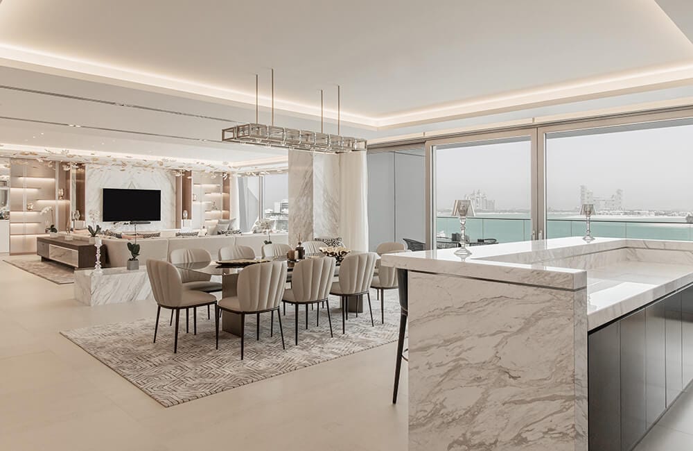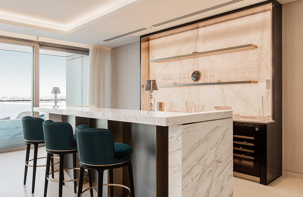 Gentle Feel Marble & Tiling Works LLC is proud to have brought a touch of luxury to a prestigious 3-bedroom apartment at Palm Jumeirah in Dubai. We meticulously installed marble in the living room, TV unit, and bar area, creating a truly sophisticated and elegant atmosphere.
