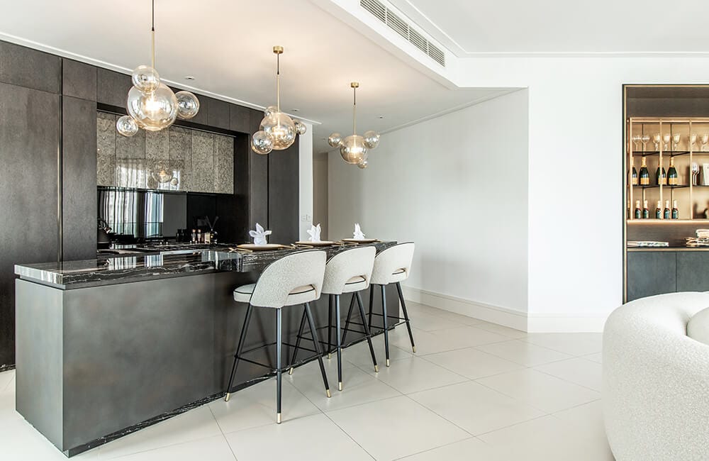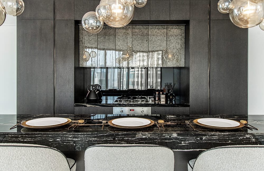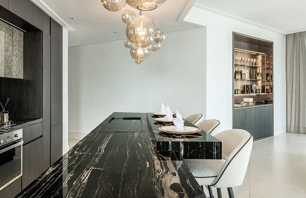 Gentle Feel Marble & Tiling Works LLC was proud to contribute to the elegance and sophistication of a stunning 3-bedroom apartment in Downtown, Dubai. The open show kitchen is the heart of the home, featuring a sleek Silver Portoro marble top and backsplash that add a luxurious touch to the space.