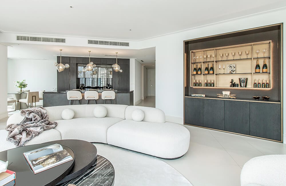 In the living area, we installed a beautiful marble finish for the champagne bar, creating an inviting and stylish spot for entertaining guests.