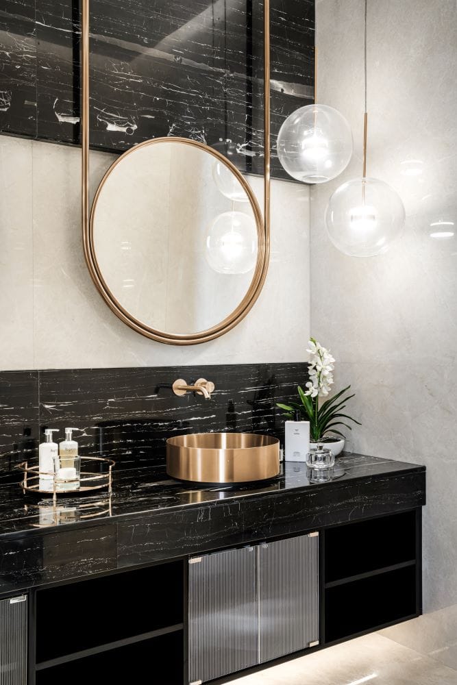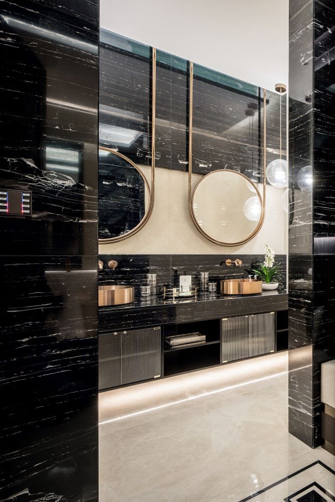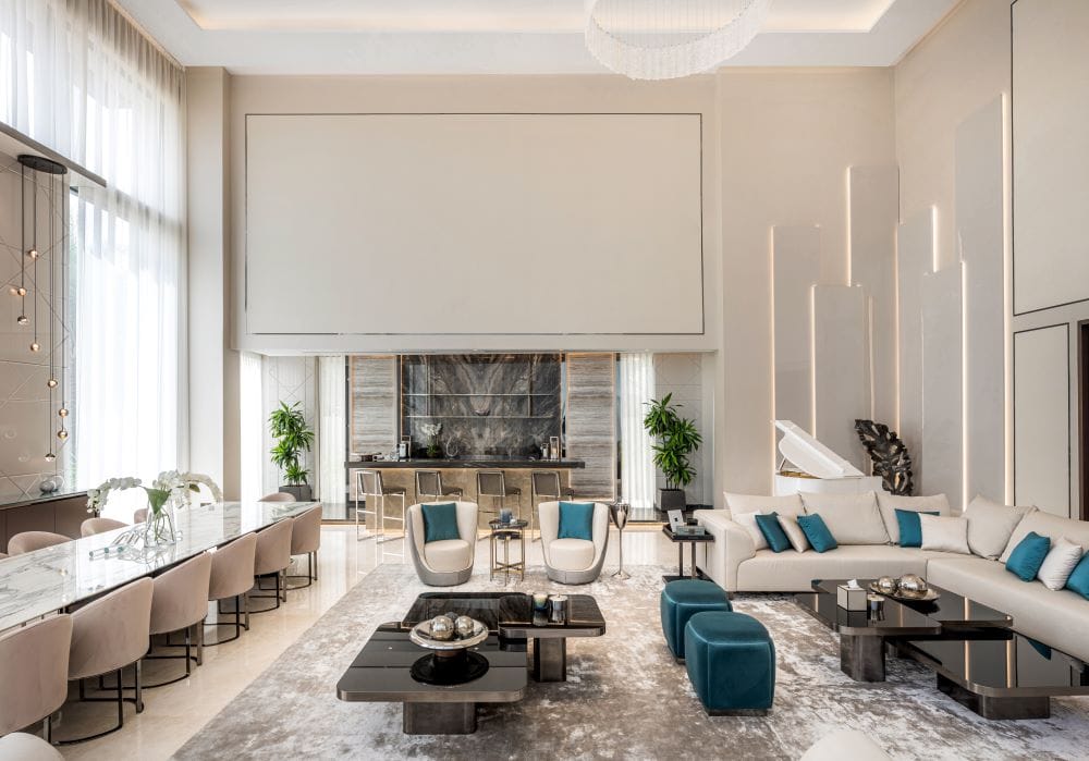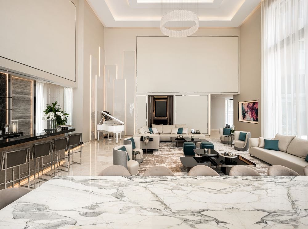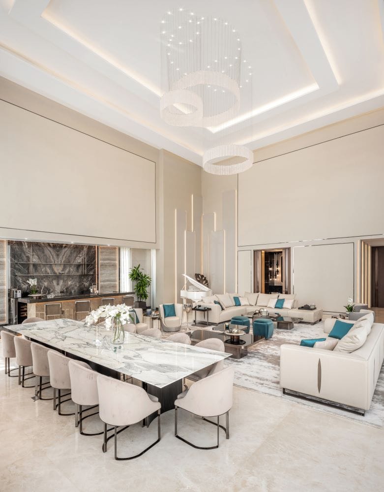 In the dining area, we crafted a bespoke marble dining table that serves as a striking centrepiece, complemented by marble flooring that flows seamlessly throughout the villa, creating a unified, sophisticated look. The bar area was designed with a sleek marble finish, offering a refined space for entertaining guests.