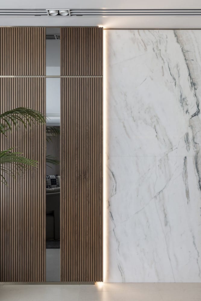 Gentle Feel Marble & Tiling Works LLC careful combination of marble and wood elements created a harmonious blend of modern elegance and natural warmth throughout this apartment.